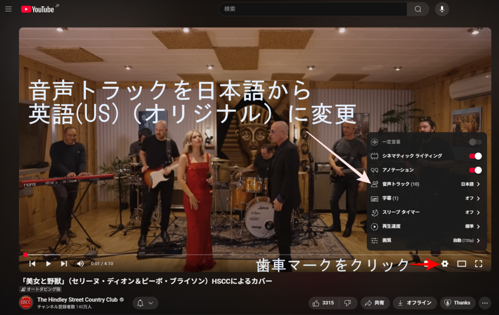 たとえば、HSCCの最新カバー動画では、原曲の歌声に重なる形で、日本語のナレーション(歌詞の読み上げ)が流れることがあります。 「歌声だけで聴きたい」「ナレーションをオフにしたい」という方は、以下の手順で簡単に切り替えられます。